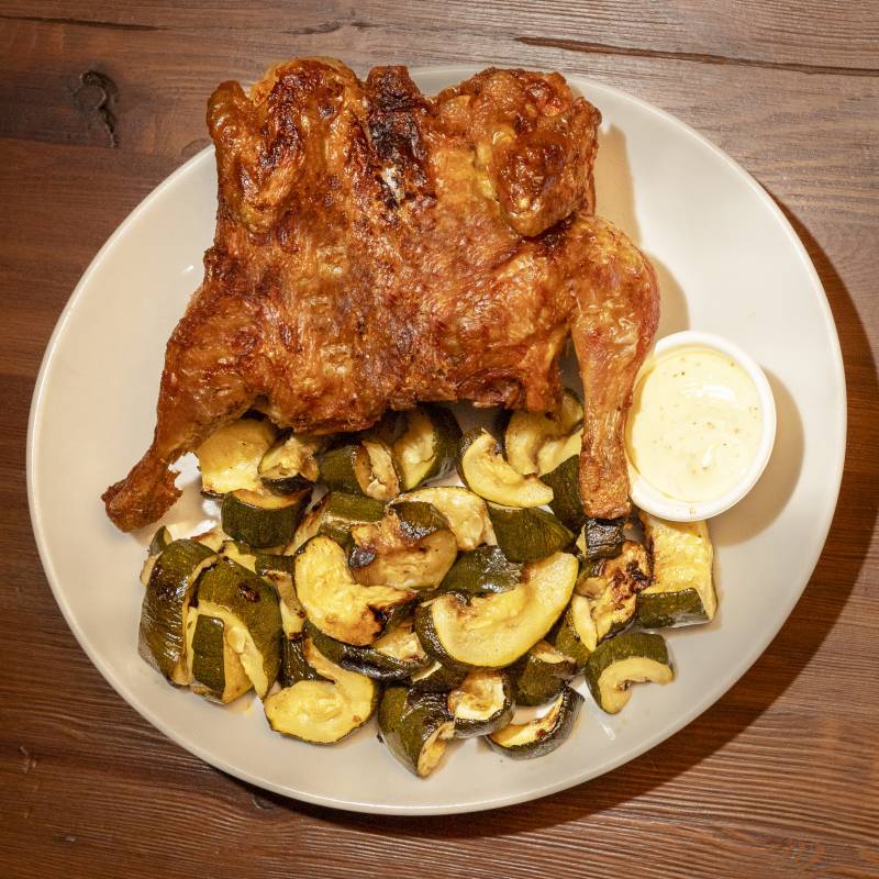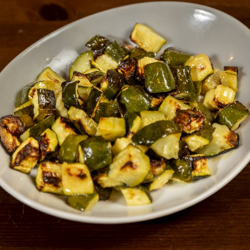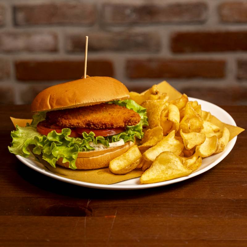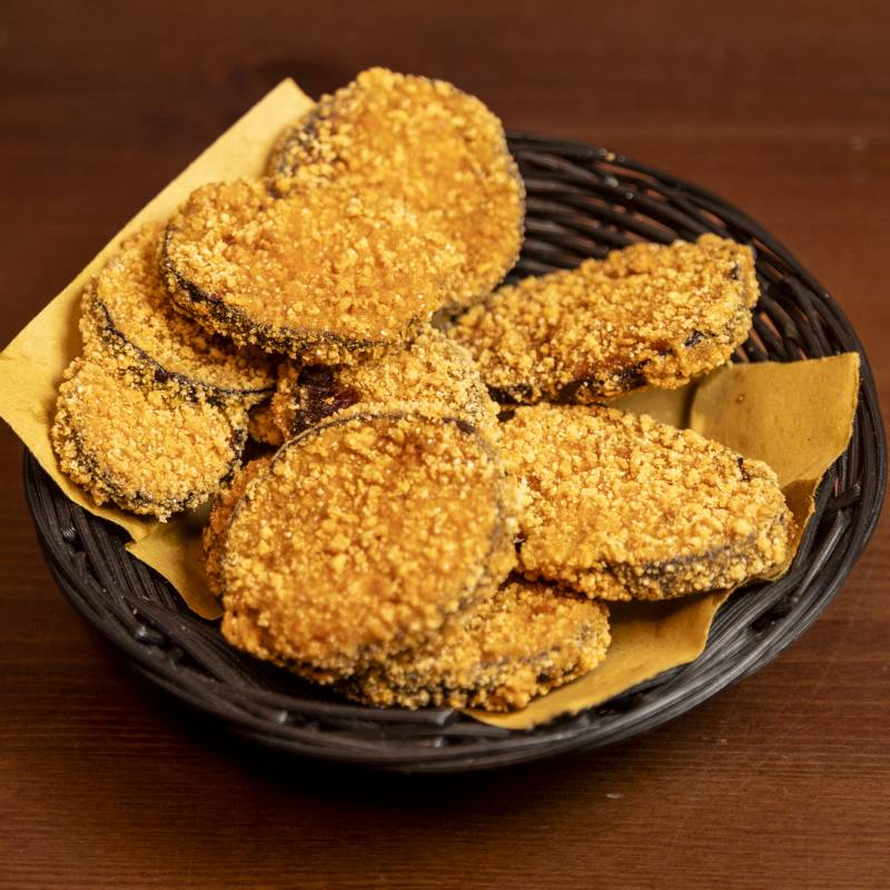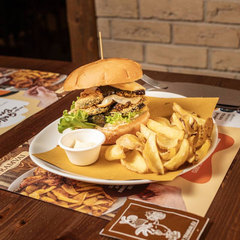 Melanzane panate e fritte, zucchine, provola affumicata, salsa Tramvai, lattuga e pomodoro. Servito con patatine