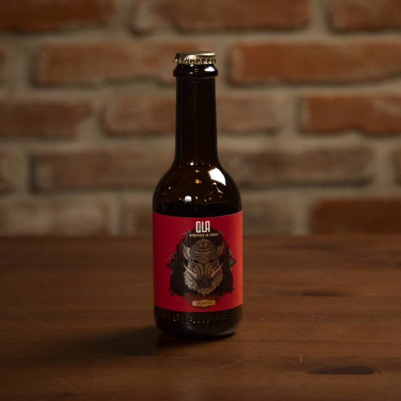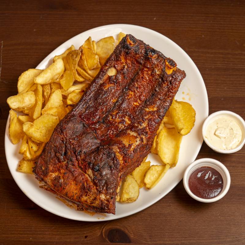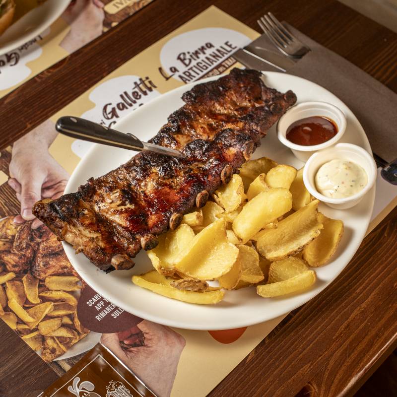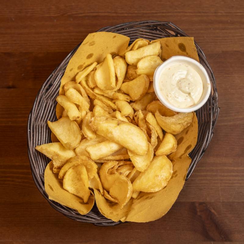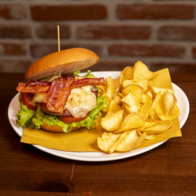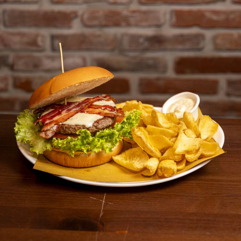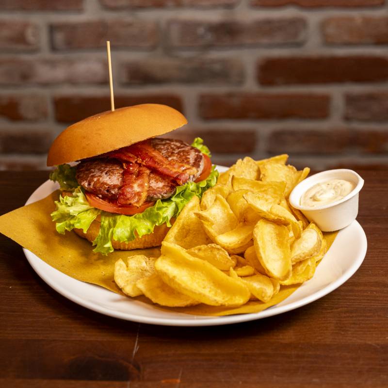 Salsa Tramvai, bacon croccante, lattuga e pomodoro. Servito con patatine e salsa