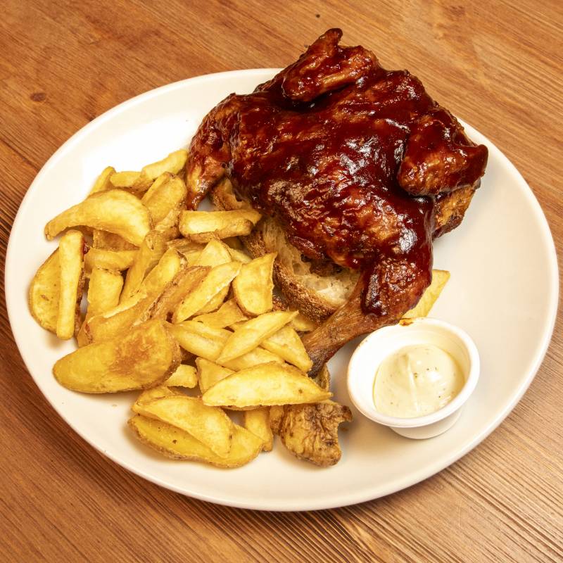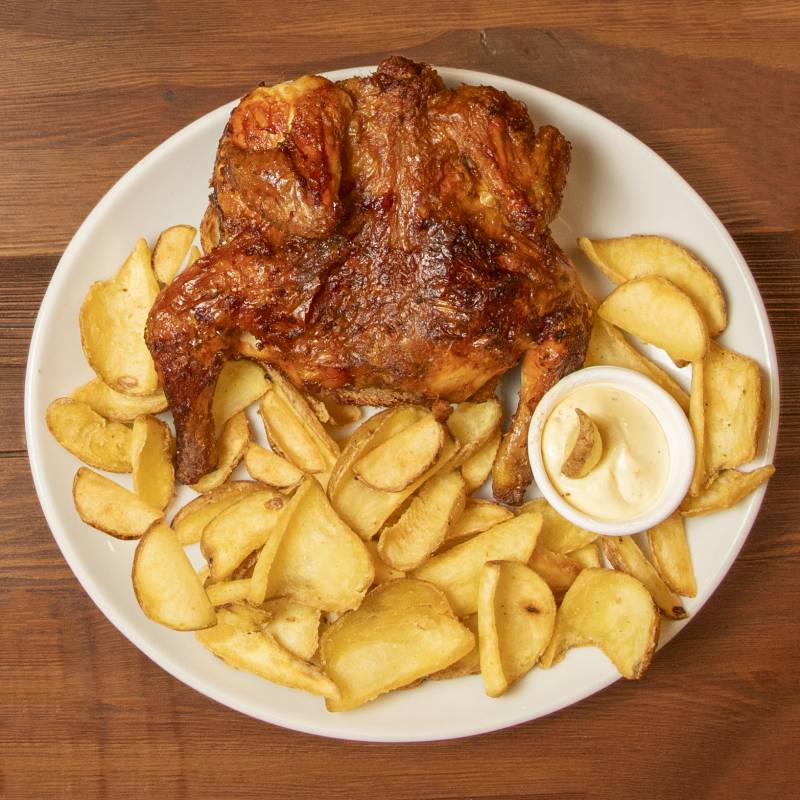 Cotoletta di pollo, lattuga, pomodoro e salsa Tramvai. Servito con patatine e salsa